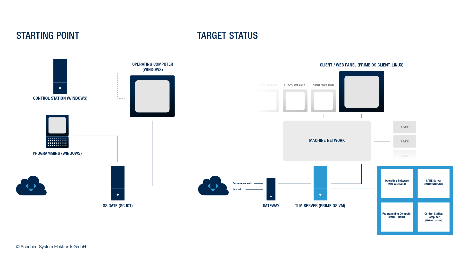 For the new generation of the TLM server Schubert places particularly great emphasis on a slim system with low production costs, optimizied maintainability, and better performance. Thus, it must be possible to replace hardware quickly in case of repairs. Furthermore, Windows should be replaced by Linux on the operating system level to increase security. Quick and secure remote access is also important for the perfect support of end customers. All in all, the resource expenditures in terms of time, organization and money are to be reduced.